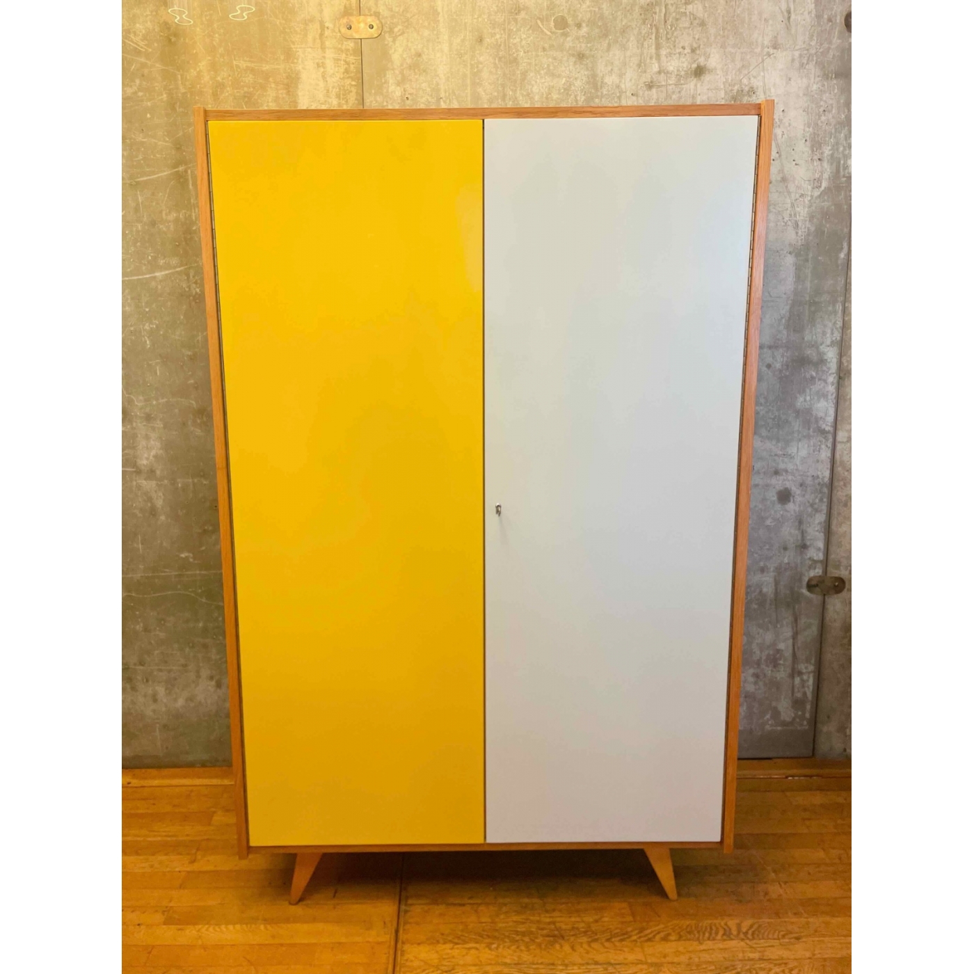 Der Kleiderschrank U-486-1 von Jiří Jiroutek ist ein herausragendes Beispiel für das tschechische Mid-Century-Modern-Design der 1960er Jahre und wurde für den Möbelhersteller Interiér Praha entworfen. Mit seiner klaren, funktionalen Formgebung und hochwertigen Verarbeitung fügt er sich nahtlos in moderne wie auch vintage-inspirierte Wohnräume ein. Der Schrank besteht aus einem stabilen Korpus aus furniertem Massivholz und ruht auf leicht ausgestellten, konischen Beinen aus Buchenholz, die ihm eine luftige und elegante Anmutung verleihen. Die Doppeltüren strahlen in einem angenehmen Gelb und Eisweiß. Die Inneneinteilung bietet eine durchdachte Kombination aus Regalfächern und einer Kleiderstange, um sowohl gefaltete als auch hängende Kleidung optimal zu verstauen. Mit seiner kompakten, aber geräumigen Bauweise eignet sich der Schrank perfekt für Schlafzimmer, Gästezimmer oder Flurbereiche und bleibt dank seines zeitlosen Designs eine begehrte Wahl für Liebhaber hochwertiger Vintage-Möbel. Die Verbindung von Funktionalität, minimalistischer Eleganz und langlebiger Handwerkskunst macht den U-486-1 zu einem Möbelstück, das auch Jahrzehnte nach seiner Entstehung nichts von seiner Relevanz verloren hat.