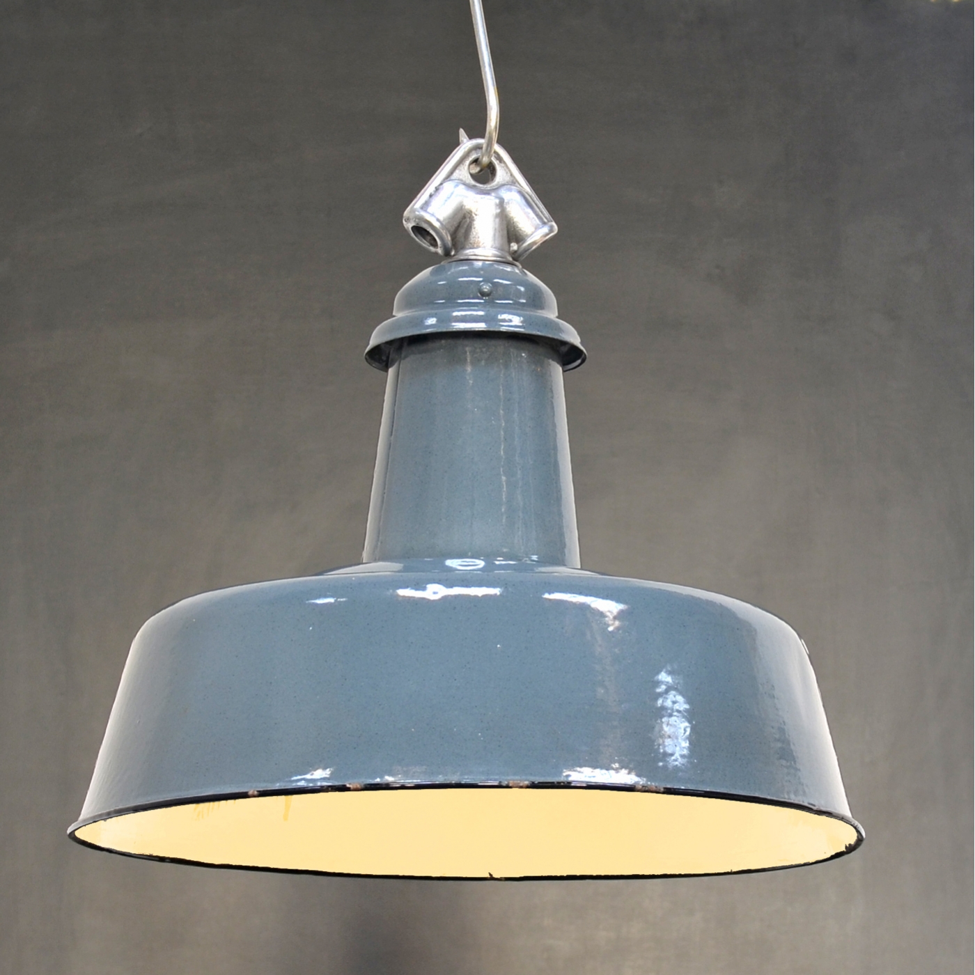 Diese schöne Industrielampe mit einer graublauen Emaillierung stammt aus den 40er / 50er Jahren. Sie ist ein ziemliches Leichtgewicht, denn sie besteht aus dünnem Stahlblech und der doppelseitige Kabelauslasser ist aus Aluminium.