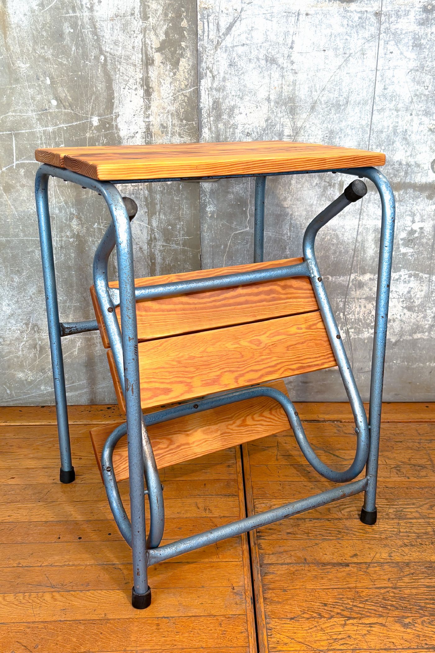 Praktisch, schlicht und solide – so präsentierte sich dieser klappbare Tritt schon in den 1950er Jahren im DDR-Alltag. Gefertigt aus stabilem lackiertem Metallgestell, überzeugt er bis heute durch seine funktionale Einfachheit. Im eingeklappten Zustand platzsparend zu verstauen, im aufgeklappten Zustand sofort einsatzbereit – ob in Küche, Werkstatt oder für die nächste Bücherwand.