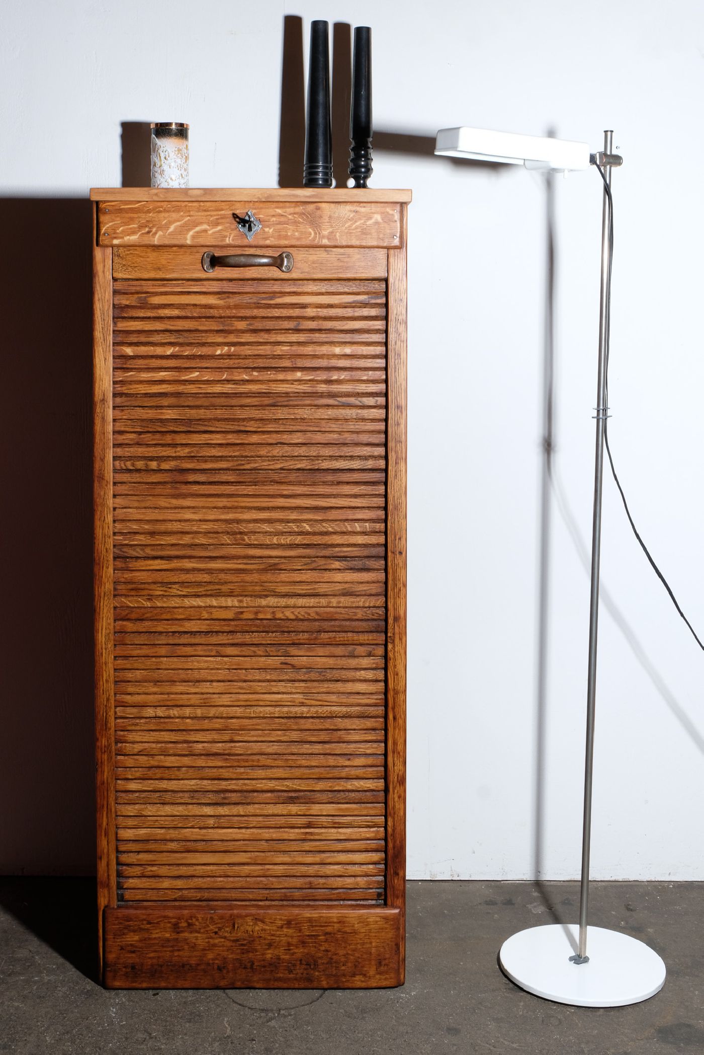 Die Restaurierung konzentrierte sich auf Stabilität, Oberfläche und Mechanik: Holz gereinigt, behutsam geschliffen und konserviert; Rollladenmechanik geprüft und leichtgängig eingestellt. Der ursprüngliche Charakter des Möbelstücks bleibt erhalten.