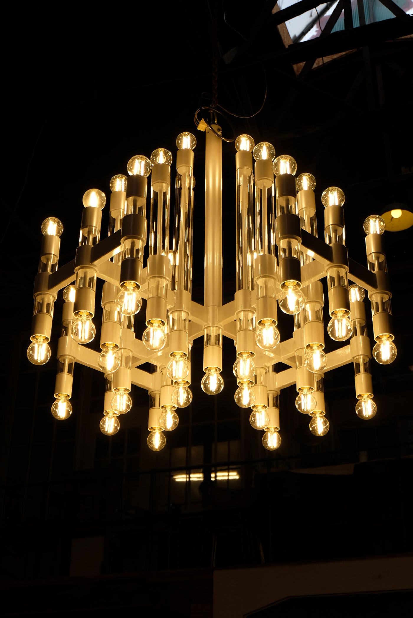Dieser außergewöhnliche Kronleuchter orientiert sich klar an den ikonischen Entwürfen Gaetano Sciolaris: klare Geometrie, rhythmisch gestaffelte Röhrenarme und eine fast architektonische Präsenz im Raum. Die 49 Leuchtpunkte sorgen nicht nur für reichlich Helligkeit, sondern auch für ein warmes, lebendiges Lichtbild, das jeden Raum in eine kleine Bühne verwandelt.